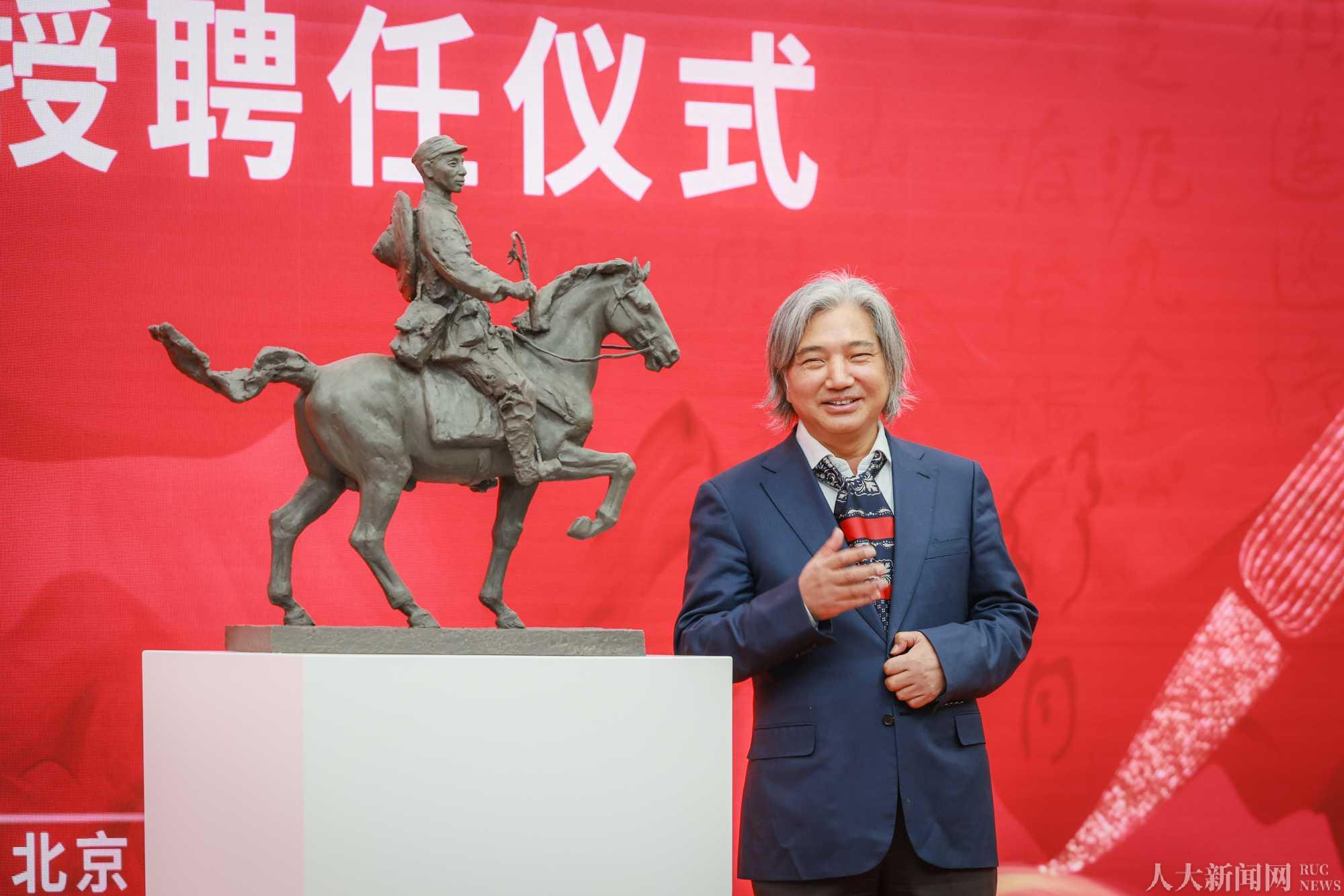 吴为山介绍雕塑情况。该雕塑为舒同诞辰120周年纪念作品之一,由国防大学军事文化学院雕塑系教授王树山创作,以青铜质感塑造出身穿红军军装、骑乘军马的舒同形象。一手控缰、一手持马鞭作书写状的细节是对舒同“战地为纸、马鞭作笔”传奇故事的具象化呈现,也是对其所作文化贡献的致敬。